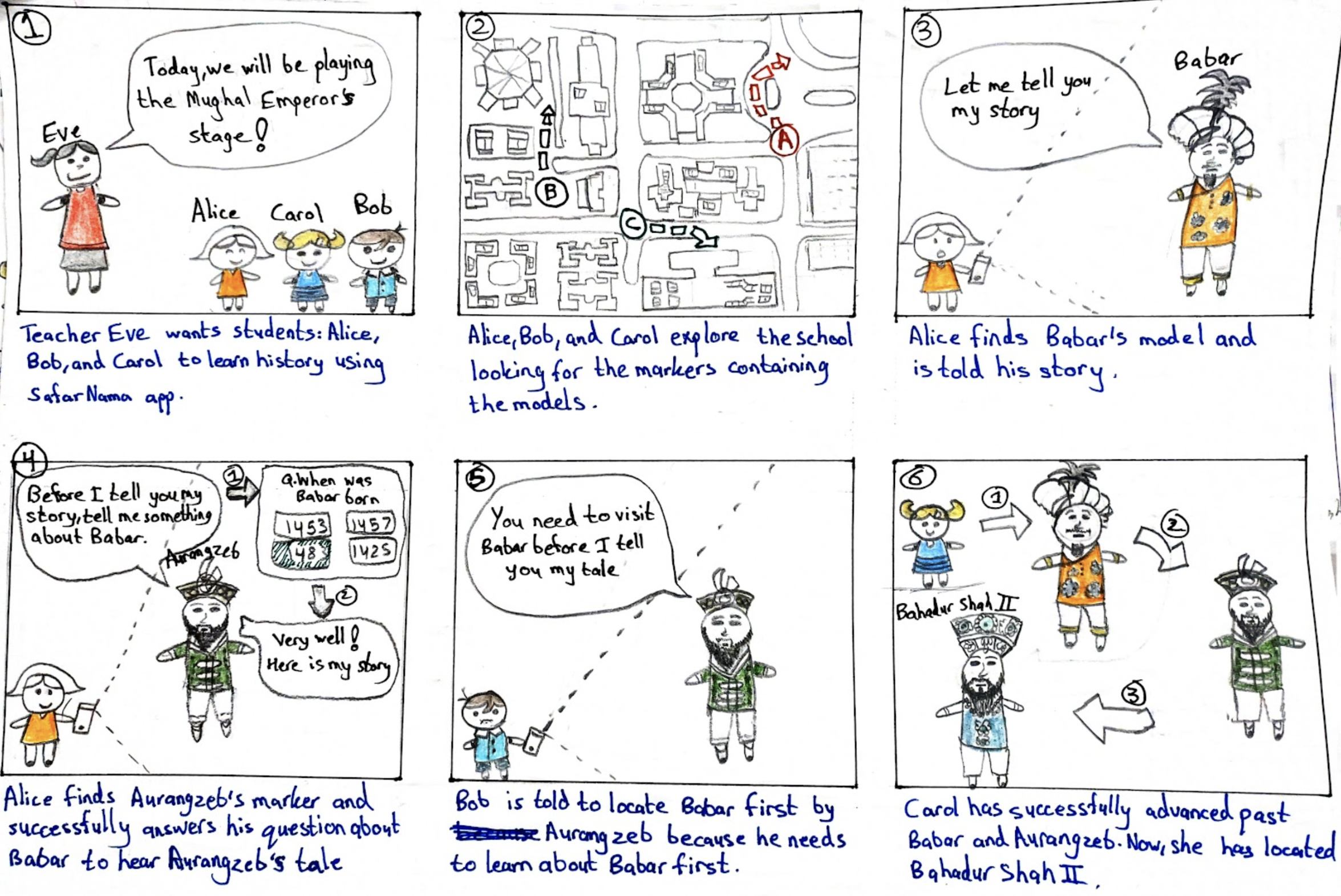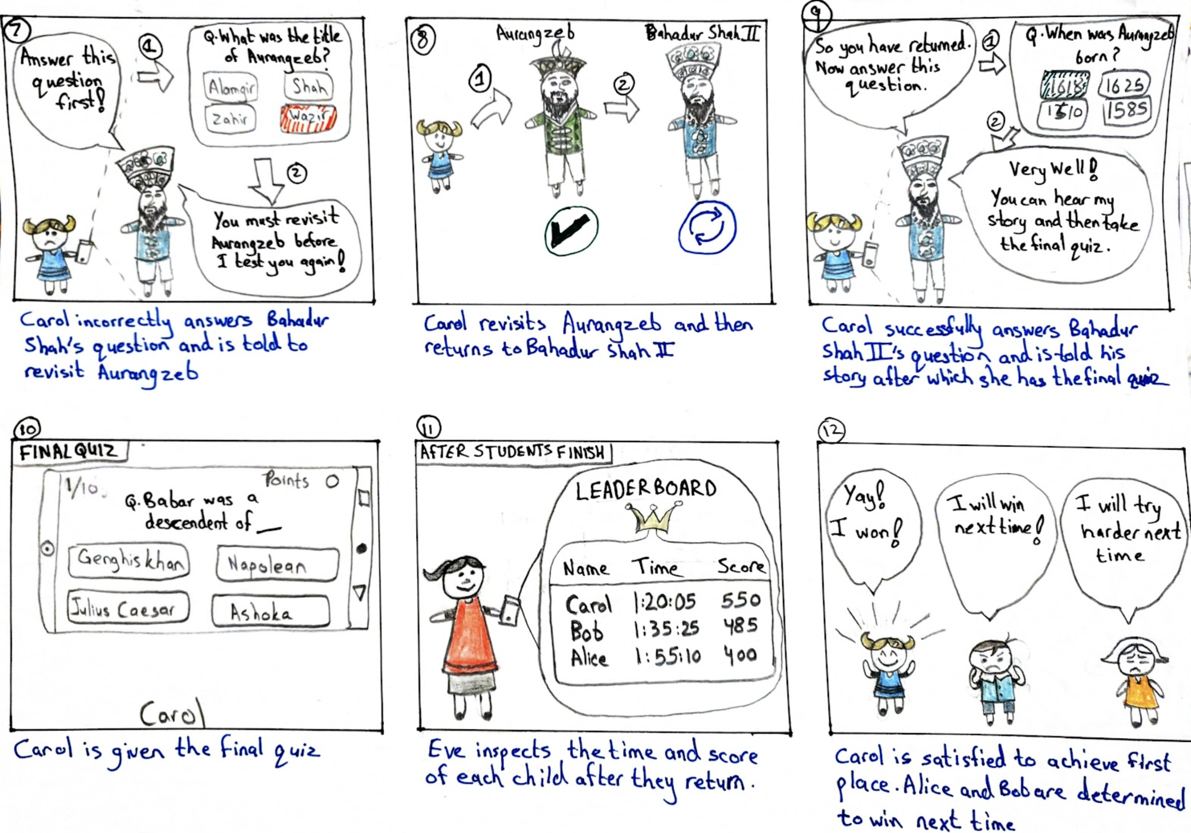 Screens 15-19: As soon as the user scans a marker, an exhibit appears (e.g., Queen Victoria). She tells her story and major life events and then asks the user to find the next exhibit (ie., Tipu Sultan). The user finds the next marker, scans it, Tipu Sultan appears and tells his story and then presents the user with a short quiz. The user has to answer the quiz correctly in order to move ahead with the tour. After successfully completing the quiz, another Mughal Emperor automatically appears (Bahadur Shah) to keep the user engaged in the story.