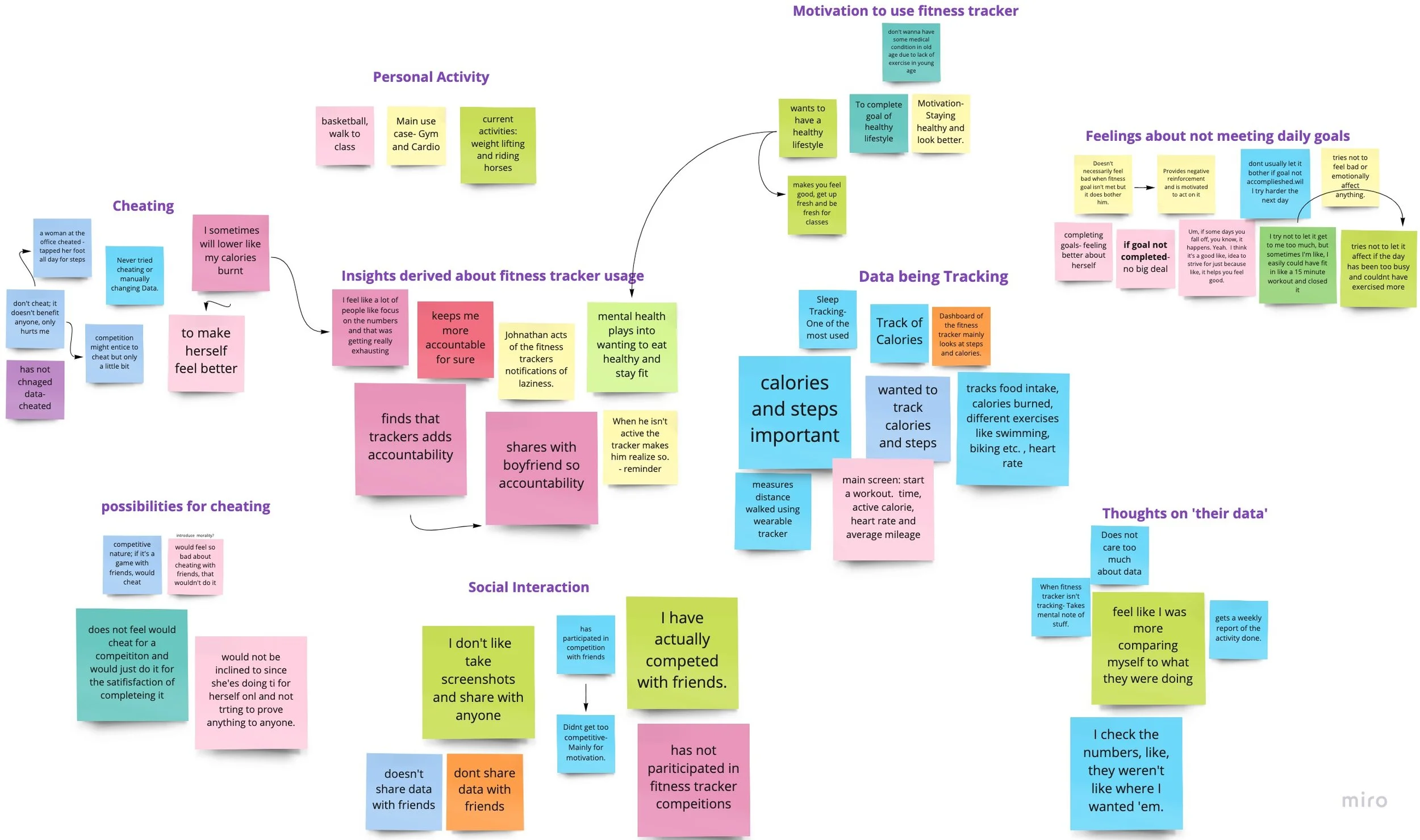For our primary research, we conducted semi-structured interviews with 4 undergraduate students in the US (2 males, 2 females) aged 19-21 who use a fitness trackers and regularly engage in a physical activity. We created an Affinity Diagram to organize the insights from our interviews.